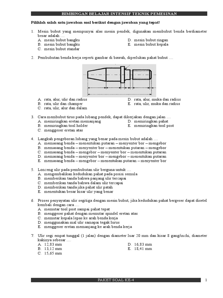 Soal pilihan ganda mesin bubut. Fungsi mesin bubut standar pada prinsipnya sama dengan mesin bubut lainnya, yaitu untuk: Mesin bubut yang mempunyai alas mesin pendek digunakan membubut benda berdiameter besar adalah. Pada mesin bubut standar terdapat beberapa alat perlengkapan mesin diantaranya: Mesin bubut yang mempunyai alas mesin pendek, digunakan membubut benda berdiameter besar adalah ….